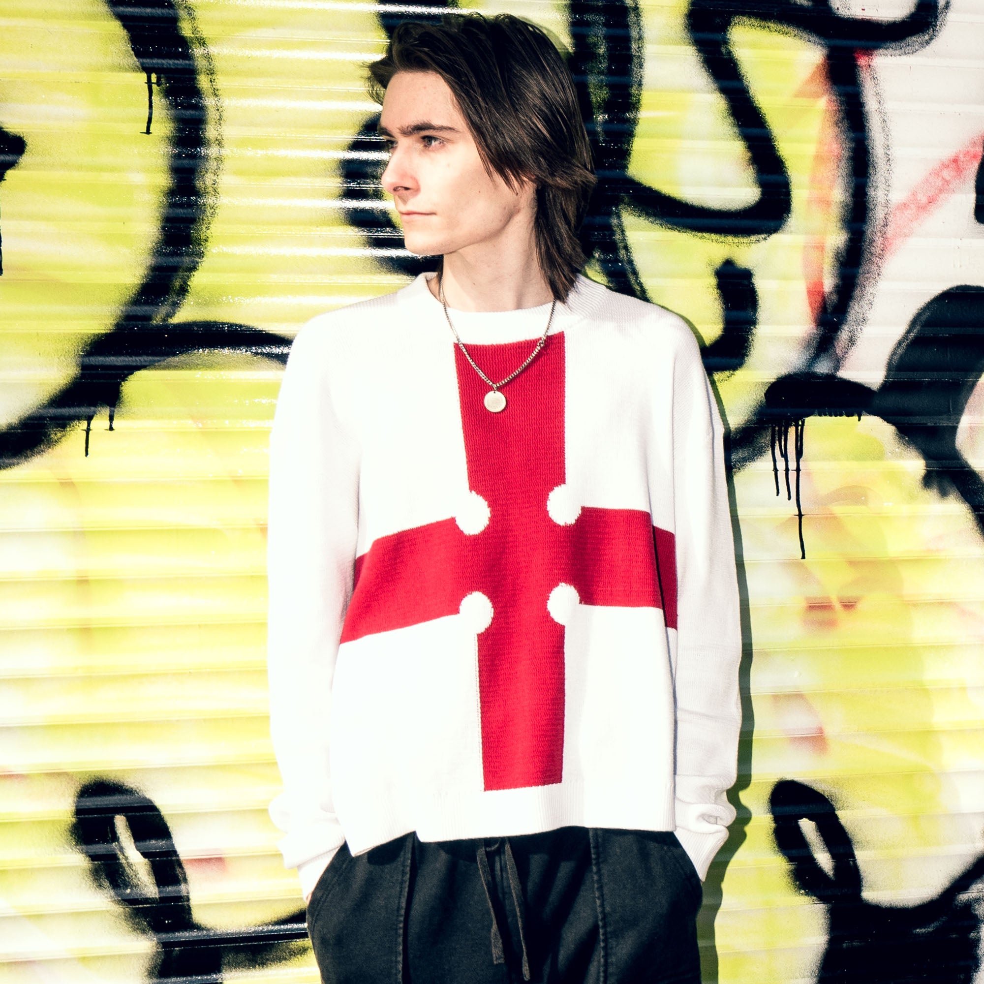 Fire Force inspired knit with the cross woven in bold red, made for a uniform look you can wear anywhere, soft cotton with a relaxed drape.